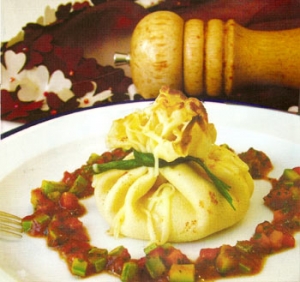 Her bir krepe bohça şekli veriyoruz. Yeşil soğanları sıcak suyun içerisine batırıp çıkarıyoruz.