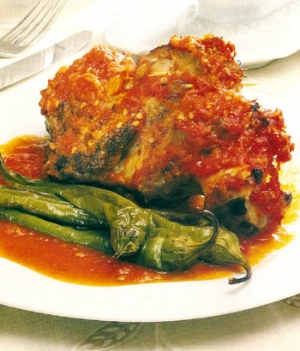 Eti, derin bir tencereye alın. Üzerine suyu ilave edip, yaklaşık bir buçuk saat haşlayın. Daha sonra, sudan aldığınız etin ortasına bıçakla derin bir çizi katıp, sarımsak dişlerini yerleştirin. Kestiğiniz kısmı kürdanla tutturun. Ayrı bir yerde domates sosunu hazırlayın. Bunun için, domatesleri rendeleyip, tuz ekleyin ve sıvıyağda pişirin. Etin üzerine, hazırladığı bu sosu sürün. 200 derece fırında yaklaşık 30dakika, üzeri kızarana dek pişirin. Servis tabağına alıp, fırınladığınız sivri biberlerle süsleyerek servis yapın.