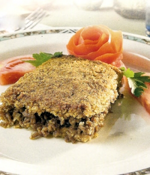 Bir fırın tepsisinin altını sıvıyağ ile iyice yağlayın ve bulgurlu köftesinden böldüğünüz parçalardan birini tepsinin dibine iyice yerleştirin. Kavurduğunuz soğanlı ve kıymalı karışımı tepsinin dibine yerleştirdiğiniz bulgurlu köftenin üzerine yayın.