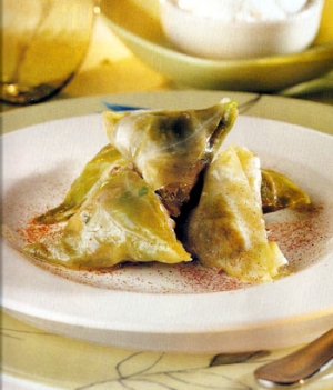 İç malzemeyi yapraklara paylaştırıp muska veya sarma şeklinde sarın. Sarmaları tencereye dizip, salça, 2 bardak sıcak su ve margarini ilave edin. 1 tutam tuz ve yarım çay kaşığı sumak serpin. Üzerini porselen tabakla örtün. Tencerenin kapağını kapatıp kısık ateşte pişirin. Sarmaları servis tabağına alıp kalan sumağı serpin. Sıcak olarak servis yapın.
