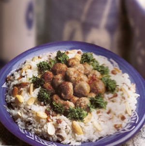 Pilavı servis tabağına alalım. Ortasını çukur şeklinde açalım. Köfteleri pilavın ortasına yerleştirelim. Domates sosu ile servis yapalım.