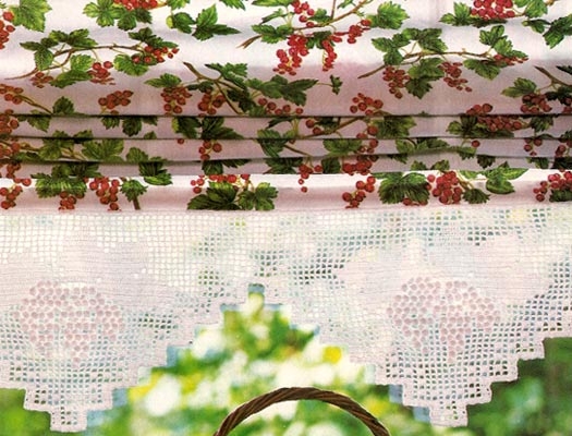 Bundan sonra tırabzanı bildiğiniz gibi örün. Bütün ilmekleri daha önceki ilmeklerden çıkartın. Tomurcukları daha önceki sıranın tomurcuklarına oturtun. Tomurcukların işin yüzünde olmalarına dikkat edin. Başlangıçtan 28 sıra sonra işi rahat bırakın ve bundan sonraki 2 ucu aynı şekilde örün. 29. sırada tüm uçlar örün. 1. 2.ve 2. 3. uçların arasına 8 tırabzandan oluşan biritler koyun. Bordürü karşılıklı gelecek şekilde tamamlayan.41 sıra sonra parça bitmiştir. Bordürü gerip ıslatın ve kurumaya bırakın, tomurcuklar üstte olmalı. Bordürü perdeye ekleyin, daha önce çubuğu çıkarın. Dantelin şeması