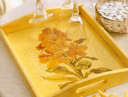Boyaları karıştırın ve tepsiye astar çekin. Çiçek motifini tepsiye yapıştırın ve kurumaya bırakın. Vernik ve laka ile eski görünüm verin.
