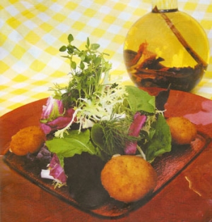 Peynirlerimizi yağda kızartıyoruz. Peçete içine çıkartıyoruz Salatanın kenarlarına peynirlerimiz koyuyoruz. Üzerine hardal sos ya da krem beyaz sos döküyoruz. Üzerine iri kıyılmış ceviz serpiyoruz. Servise hazır hale getiriyoruz.