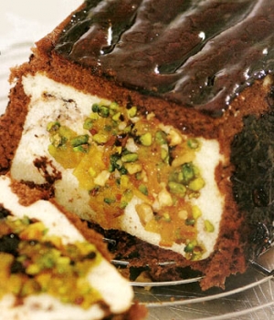 Dikdörtgen bir kalıbı yağlı kâğıtla kaplayın. Pandispanyayı parçalar halinde keserek kabin dibine ve yanlarına döşeyin. Üzerini kapatmak için bir parçayı kenara ayırın. Tozşeker ve suyu karıştırarak hazırladığınız şurupla, kalıptaki kekleri ıslatın. Bir tencereye süt, irmik, rendelenmiş portakal kabuğu ve portakal reçelini koyup ocağa oturtun. Sürekli karıştırarak muhallebiden daha koyu bir kıvama gelinceye kadar kaynatın. .Ocaktan alıp üzerine labne peynirini ekleyip karıştırın. Çikolata parçalarını da ilave edin ve kenara alın. Karışım ılınınca kek kalıbının içine dökün. Üzerini, ayırdığınız kek parçası ile kapatın. Buzdolabına koyup donuncaya kadar bekletin. Daha sonra ters çevirerek kalıptan çıkarın. Üzerine benmari usulü eritirmiş biter çikolatayı sürün. Onun üzerine de frambuaz sos gezdirin. Dilimleyip servis tabaklarına alın. Üzerlerine portakal reçeli sürün ve fıstık serperek servis yapın.