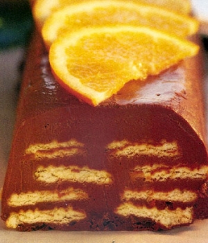 Bir adet portakalın kabuğunu rendenin ince tarafıyla rendeleyin. Çikolataları benmari usulü erittikten sonra kremayı ilave edip karıştırın. Ardından labne peyniri ve rendelenmiş portakal kabuğunu ekleyin. 20 cm uzunluğundaki dikdörtgen kek kalıbının içini yağlı kağıtla kaplayın. içine bir miktar çikolatalı karışımdan dökün. Kabuğunu rendelediğiniz suyunu sıkarak bisküvileri bu suya batırıp, çıkarın. Kek kalıbının içindeki çikolatalı karışımın üzerine bir sıra bisküvi yerleştirin. Bisküvilerin üzerine yeniden çikolatalı karışımdan dökün ve bisküvi yerleştirin. Malzemeler bitene dek ve en üst kata çikolatalı karışım gelecek şekilde bu işleme devam edin. Üzerini folyo ile kaplayarak buzdolabının alt rafında bir gece dinlendirin. Çıkardığımızda dilimleyip, portakal dilimleriyle servis yapın.