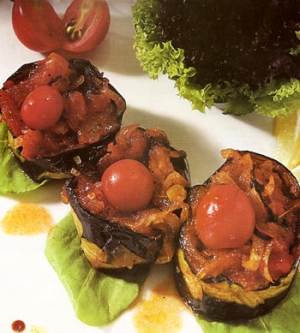 Bir tava içerisinde sıvı yağda altın sarısı olana dek kızartın. Kızarmış patlıcanları bir kâğıt peçetenin üzerine alarak fazla yağını alın. Bir tepsiye patlıcanların ağzı yukarı gelecek şekilde dizin. Diğer tarafta hazırladığınız iç malzemeyi patlıcanların içine doldurun.