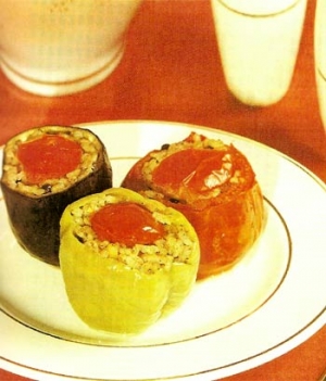 Sebzeleri pirinçli karışımla doldurun. Domates dilimleriyle dolmaları kapatıp tencereye dizin.