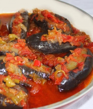 Patlıcanları, karnıyarıkta olduğu gibi alacalı soyun. 1 saat tuzlu suda bekletin. İç malzemesini hazırlayın . Soğanları zeytinyağına atıp üzerine bir tatlı kaşığı toz şeker atın, yakmadan sarartın. kabuğu soyulmuş küp doğranmış domatesleri, biberleri ve sarımsakları ilave edin. Üzerine tuz karabiber ve 1 tatlı kaşığı toz şekeri ilave edin. Bütün malzemeyi 4-5 dakika pişirin. Patlıcanların ortasından kesin bıçakla azıcık içinden alınki içini harcı koyabilesiniz. Karnıyarık tenceresi dediğimiz yayvan bir tencere veya tavaya dizin. Üzerine kalan harcı yerleştirin. Bir çay bardağı sıcak su ilave edip, patlıcanlar yumuşayıncaya kadar pişirin.